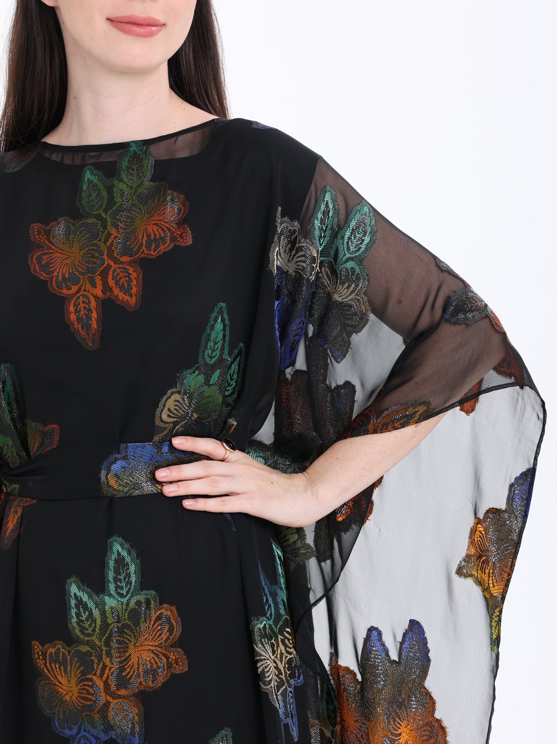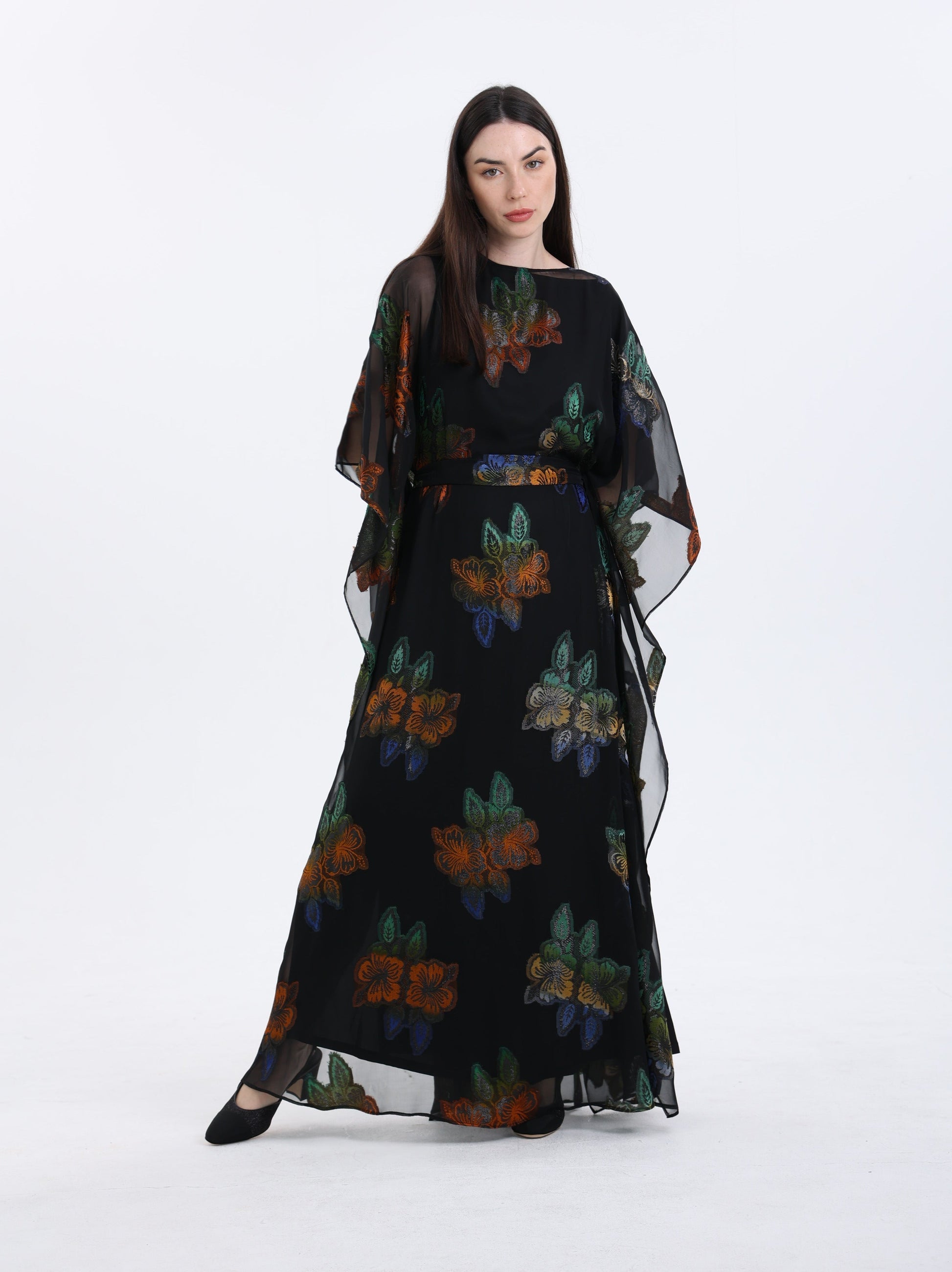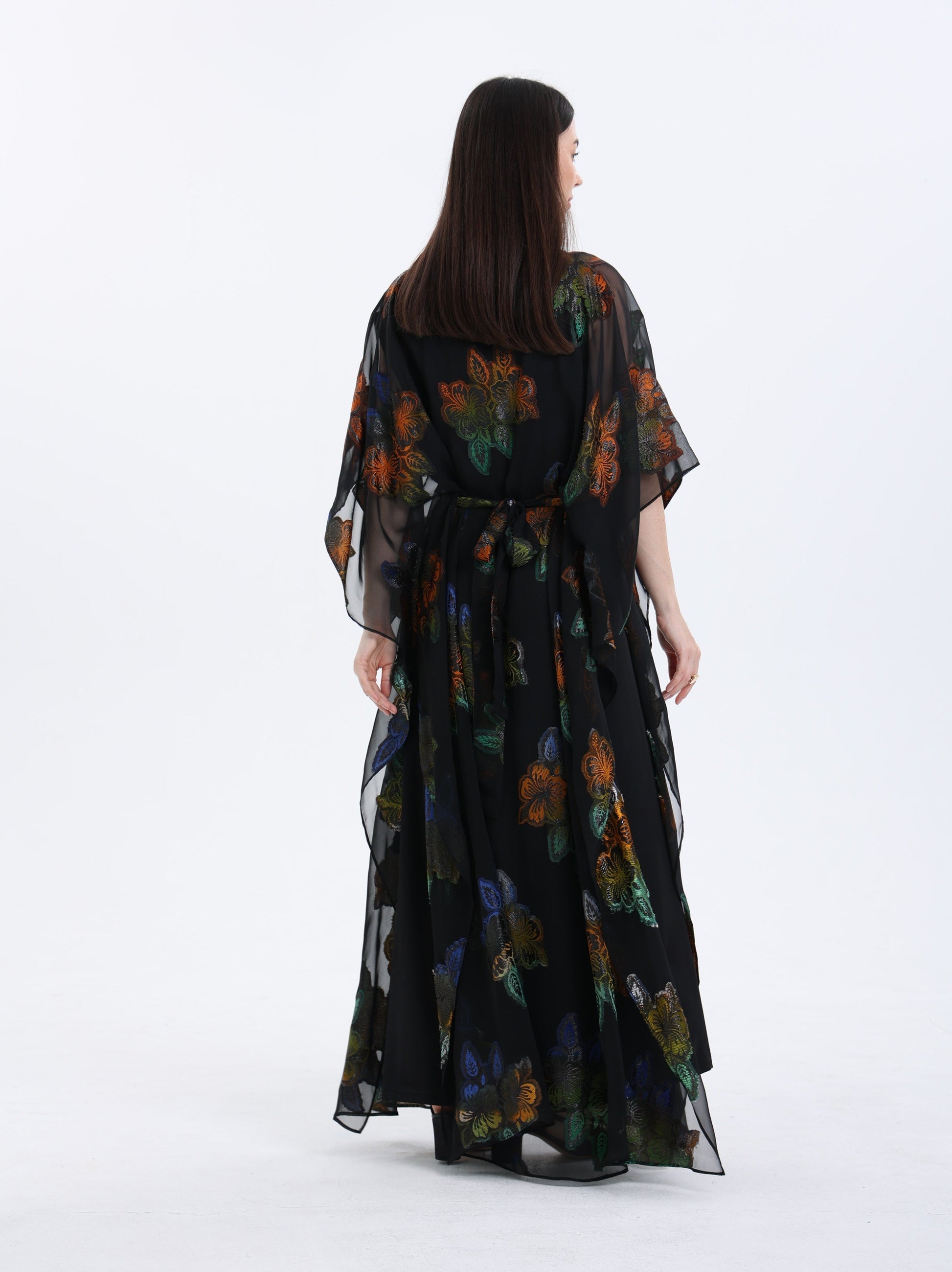 Two pieces set: The vibrant tlija orned with lively floral motifs paired with an elegant satin robe. Both pieces feature slide slits, adding a touch of allure and movement. The integrated belt allow to accentuate the waist, with the option to fasten it on the inside.