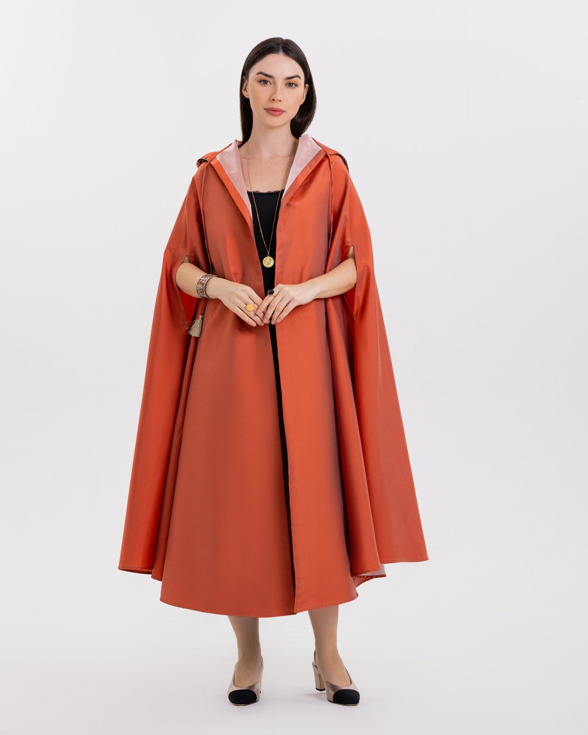 Elegant Taffeta Burnous featuring a beautifully embroidered linen hoody, complemented by a contrasting colored lining. Wrap yourself in sophistication and style !