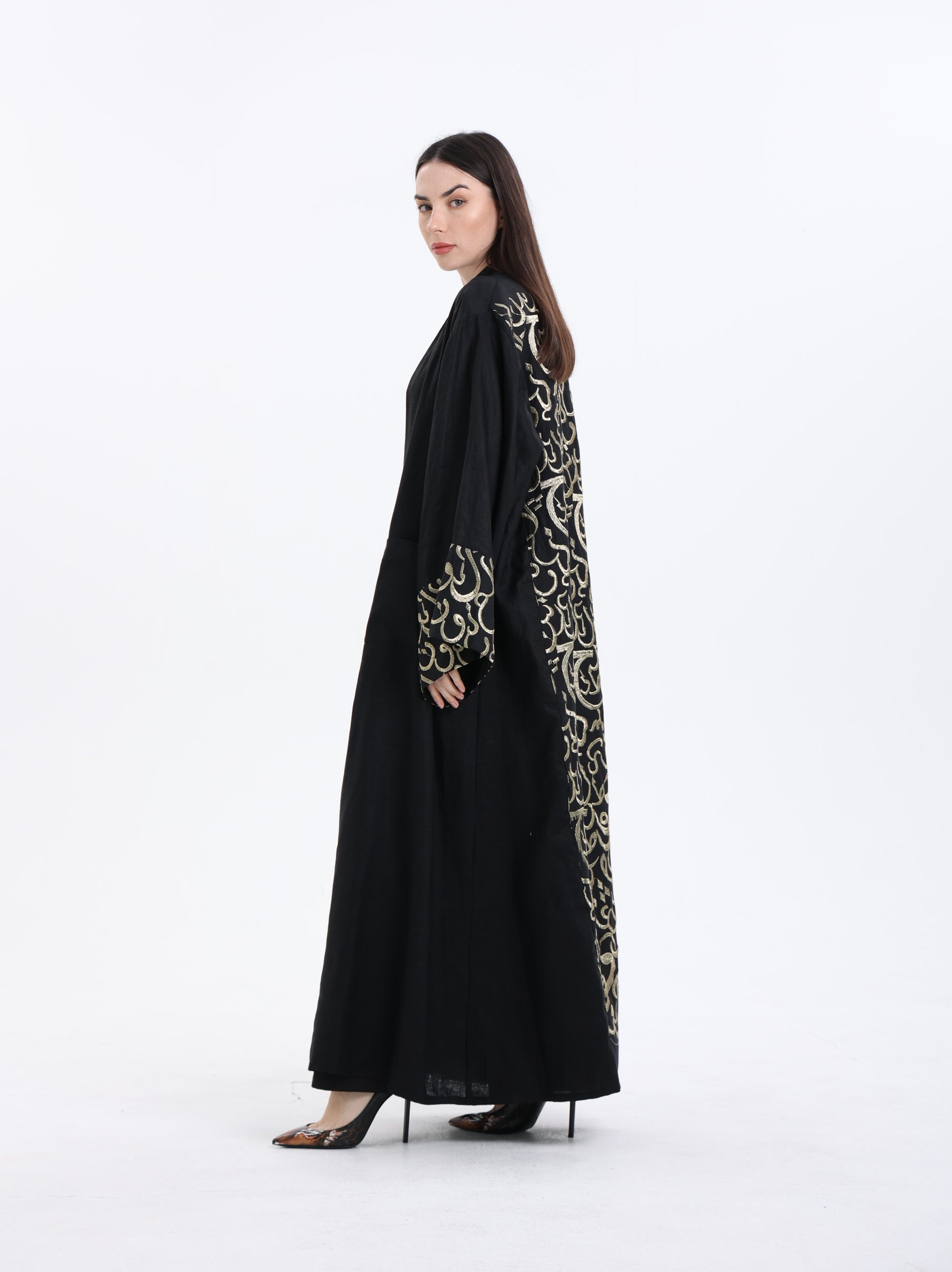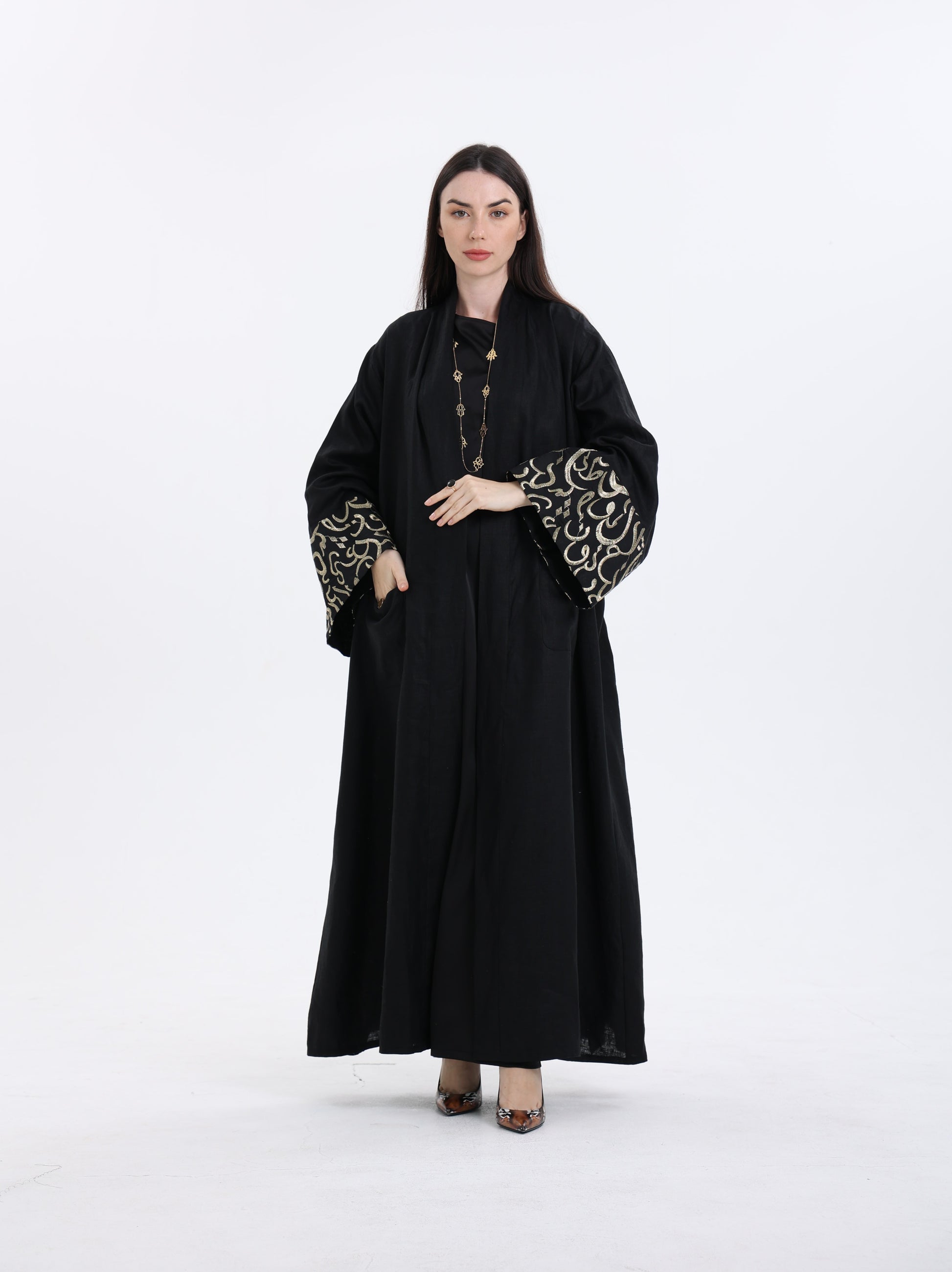Pure linen abaya adorned with intricate Arabic calligraphy delicately woven along the sleeves and back. Crafted for both style and practicality, it features convenient pockets ensuring effortless elegance in every step.
